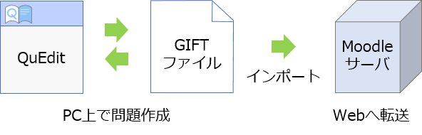 - 完成した問題ファイル(GIFTファイル)は,Moodle™のインポート機能で転送します。