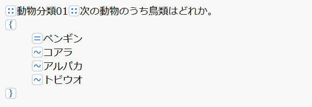 - テキスト編集ベースの問題作成は,プログラミング言語のように文法構造の記述が必要ですが,テンプレート挿入によって文法を覚える必要がありません。