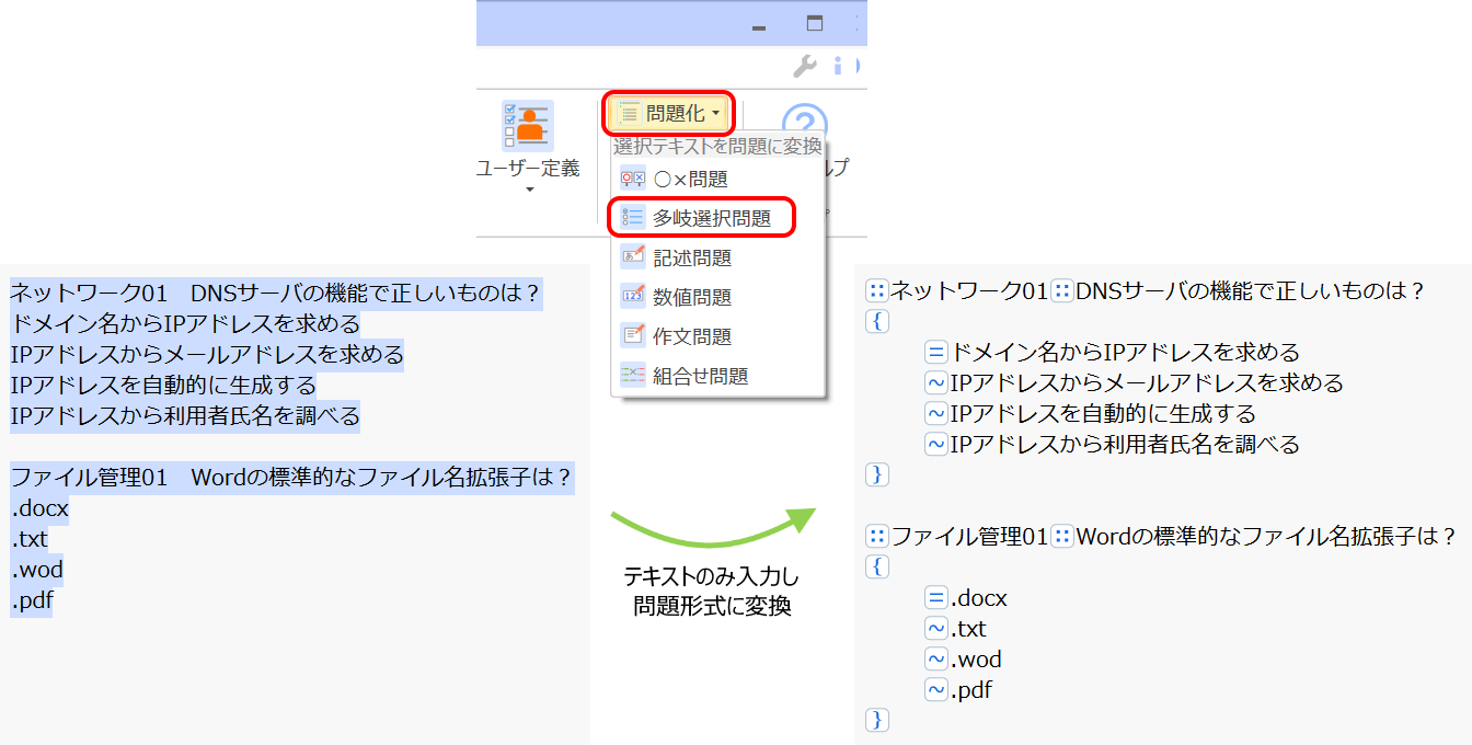 - 先に問題のテキストのみ入力しておき,それらを選択して「問題化」機能で問題形式に一括変換もできます。